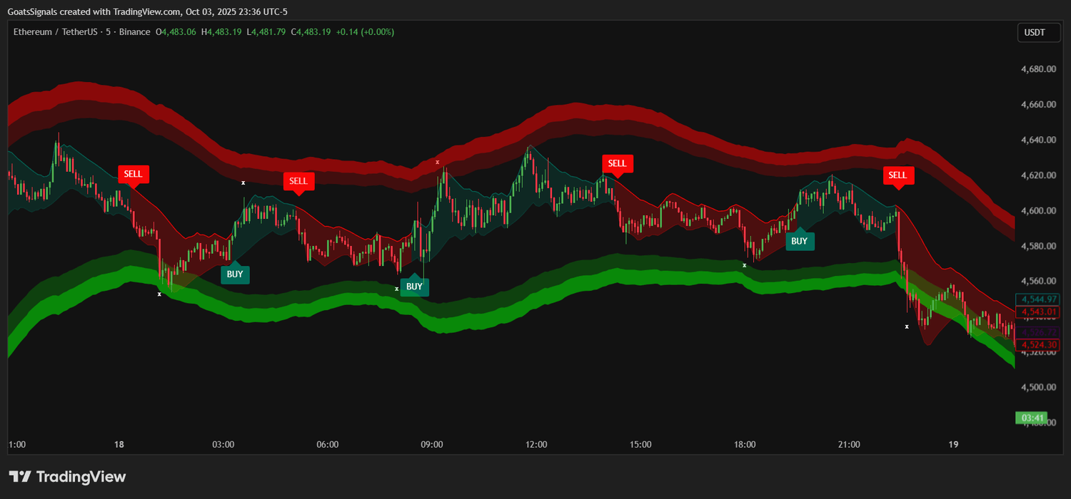 Custom bands designed to detect potential market reversal zones. When price touches or pierces these bands, it may signal exhaustion or reversal, particularly if supported by other signals.